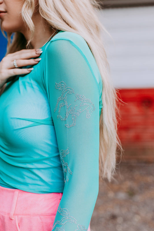 Dylan Turquoise Rhinestone Embellished Mesh Long Sleeve Top