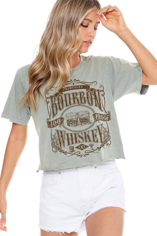 Bourbon Whiskey 100 Proof Graphic T-shirt Washed Faux Crop TeeRegular price $45.00Regular priceUnit price per-
