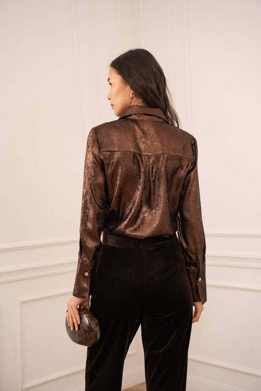 Léa Shiny Metallic Button Up Shirt in Brown