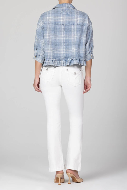 Blue Denim Plaid top with Ruffle Hem