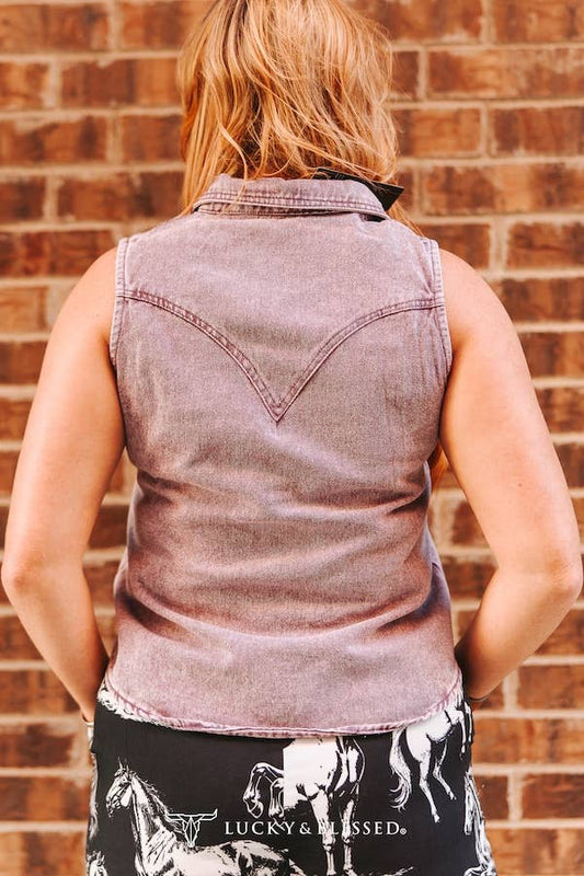 Lavender Denim Mineral Wash Sleeveless Pearl Snap Top