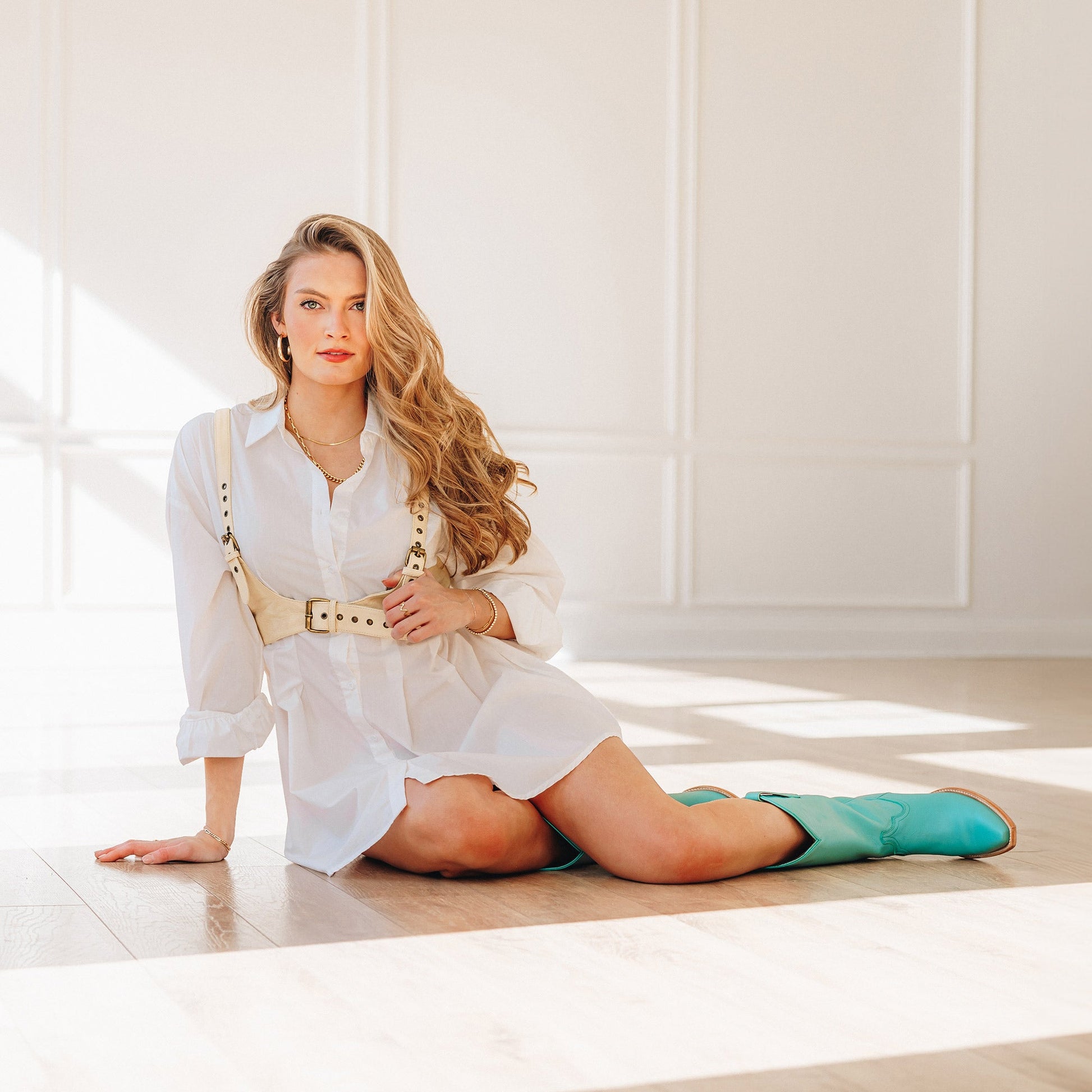 It's giving western. Timeless snip toe and classic cowgirl silhouette. Meet Emma Jane in Turquoise Blaze.