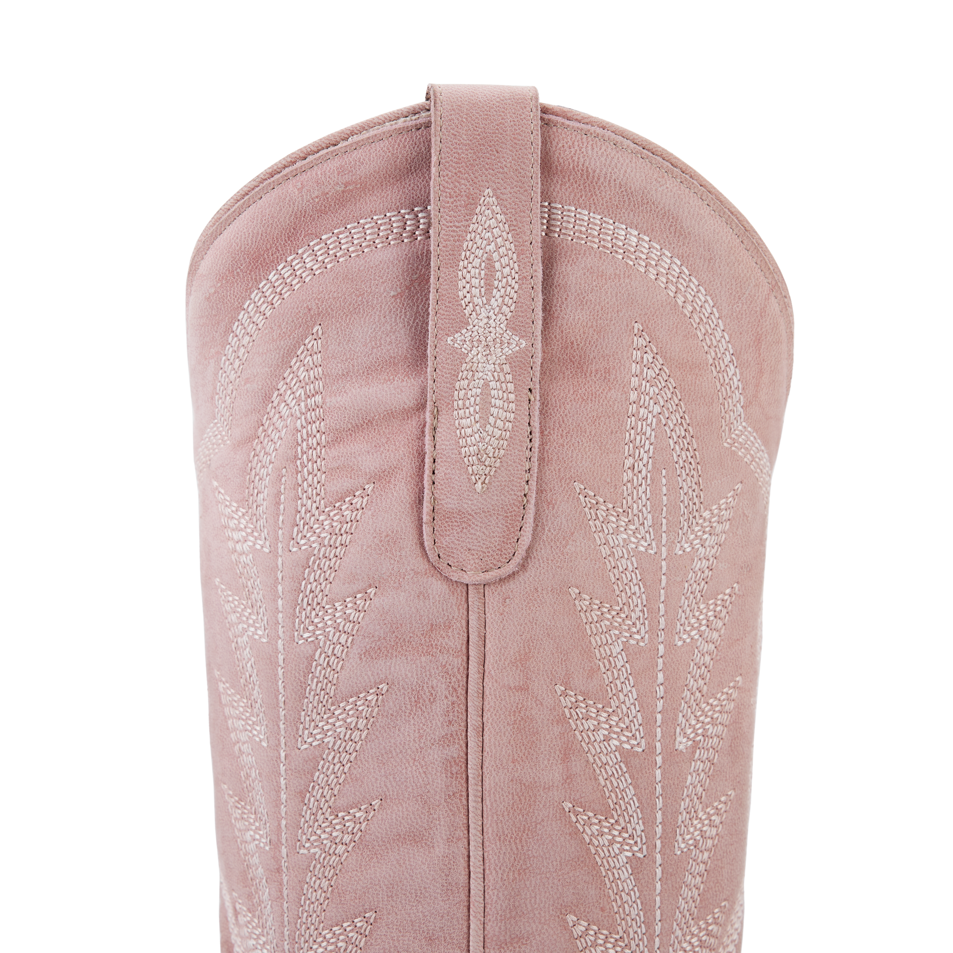 She's the perfect blush cowgirl boot. Heirloom quality with a western vibe. The classic snip toe profile is embroidered to perfection with a twist on traditional flame stitch. Her Blush finish makes it a perfect fit for everyday to girl's night out.