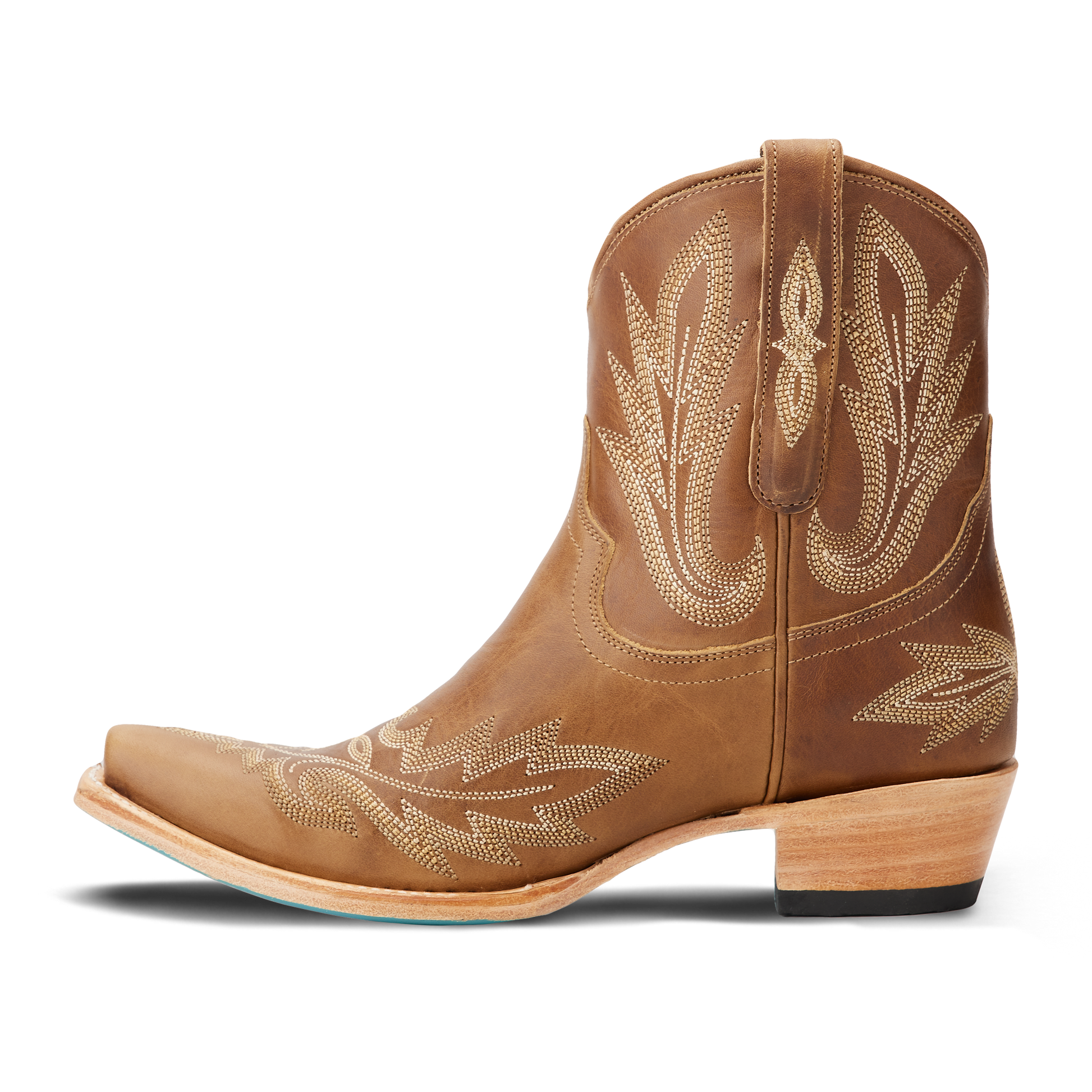 Heirloom quality ankle boots with a western influence. The classic snip toe profile is embroidered to perfection with a twist on traditional flame stitch in bootie form. She's short, sweet, and just the right height to pair well with your wardrobe.