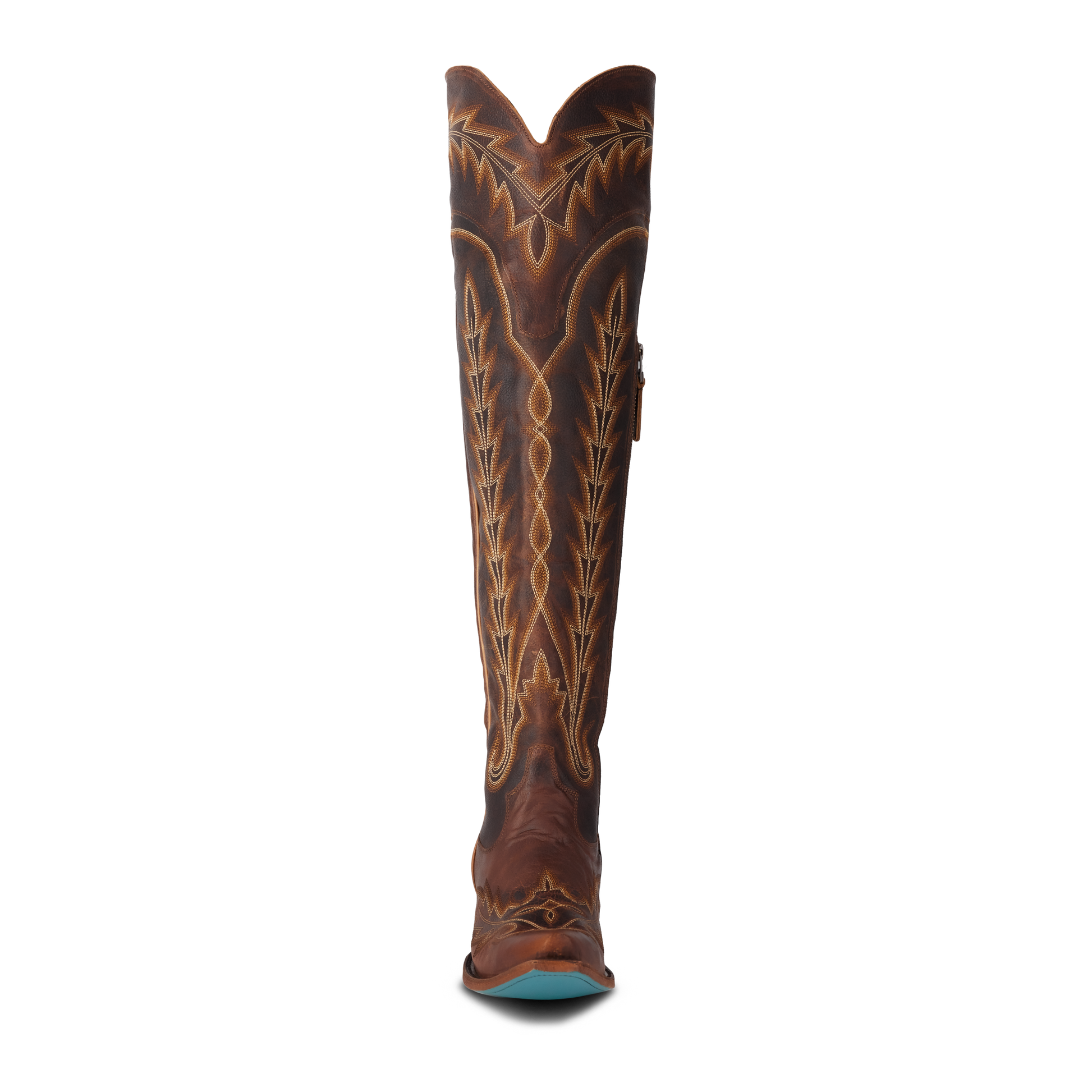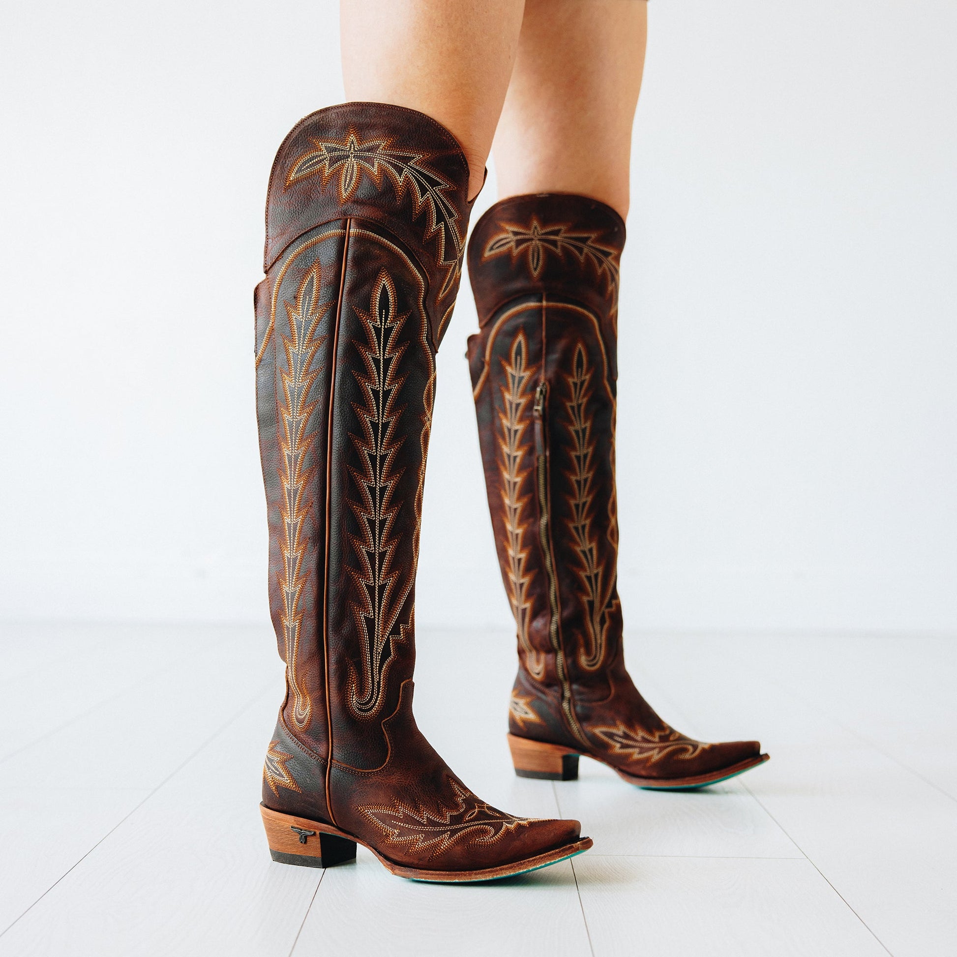 Sexy Over the Knee boot kicking classic retro stitch up all the notches. Functional corset with wide tongue to accommodate all sexy leg types. Customize the corset to your leg one time and the easy in, easy out zipper will take care of the rest.