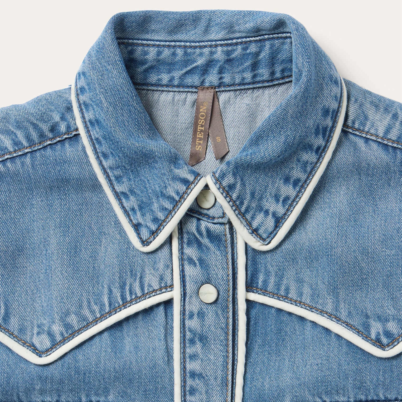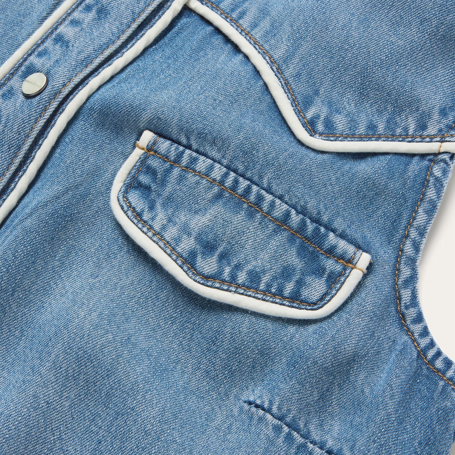 This sleeveless western shirt is crafted from soft, sustainable 100% lyocell denim and features retro-style cream contrast piping at its yokes, collar, placket and pocket flaps. Cut in our flattering Boyfriend Fit, it has single point curved front and back yokes, a full snap front and front faux pocket flaps.