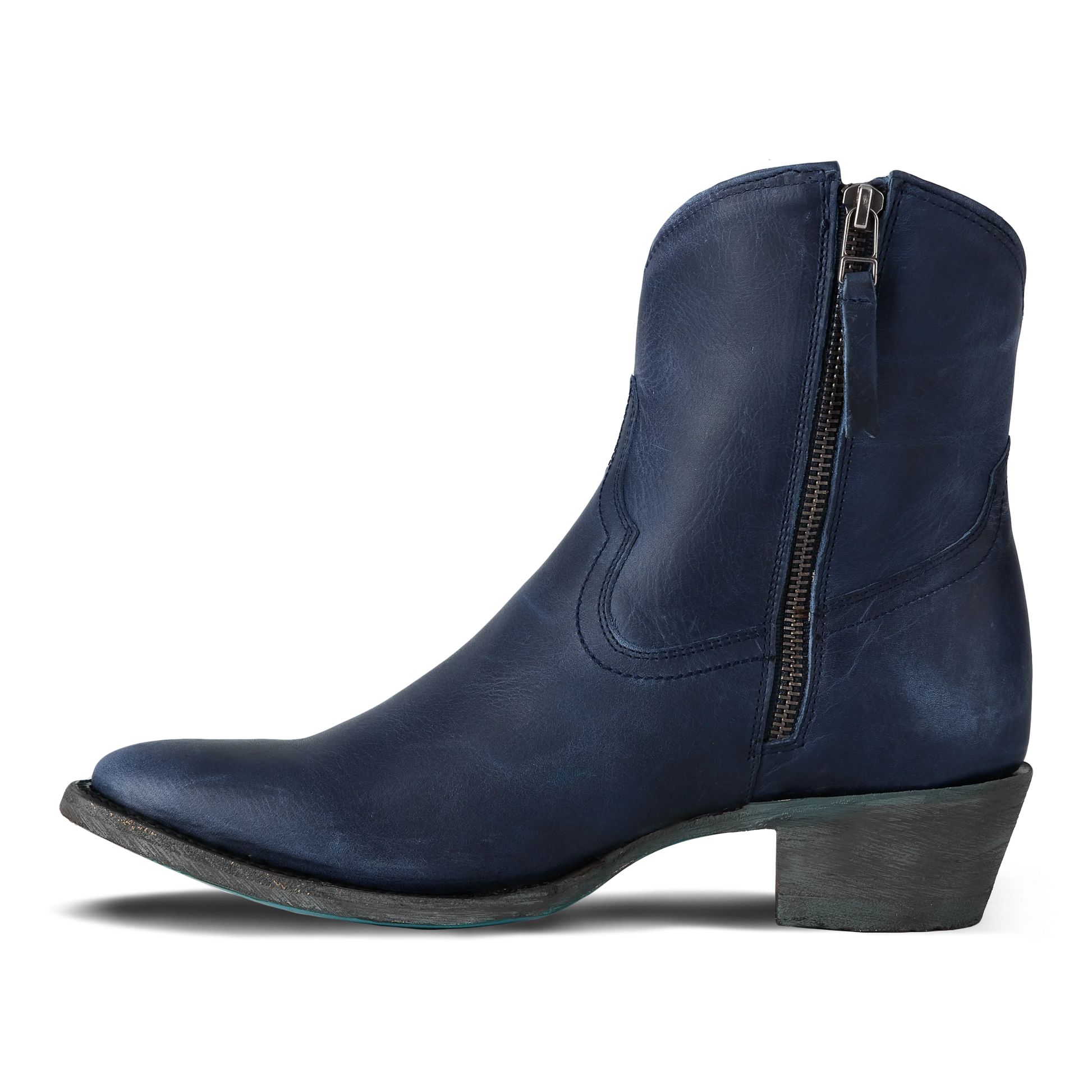 Meet The Plain Jane Bootie in Midnight Navy. Plain Jane bootie by Lane is made of high quality leather. Heirloom quality ankle boots with a western influence. Features a classic snip toe profile. A go-to, must-have ankle boot for every occasion.