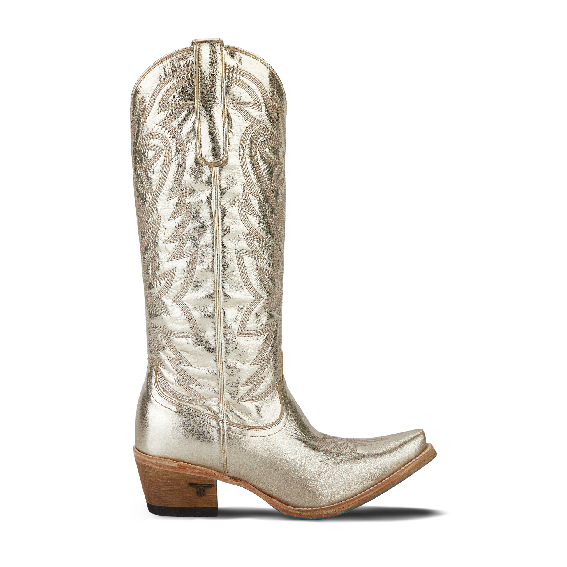 She's the perfect chic, metallic cowgirl boot with a pop of gold right off the runway. This classic snip toe is accompanied by an abstract cosmic starburst pattern and retro-inspired toe stitch. Level up your wardrobe with this blue bottom hottie.