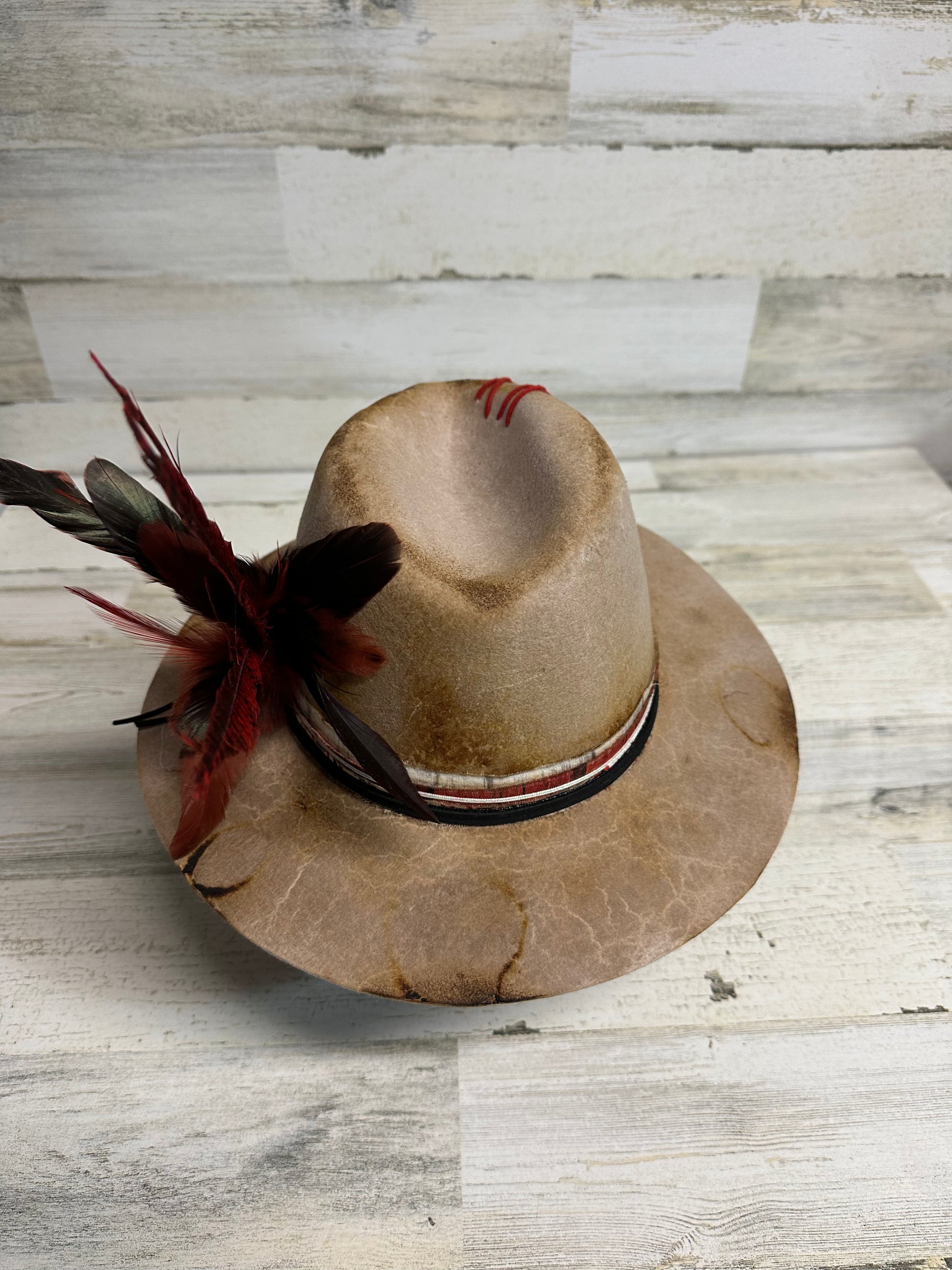 Southern & Slow Cowgirl Hat in Tan is a one of a kind cowboy hat for cowgirls custom burned by Calamity Anne exclusively for Bourbon Cowgirl! One size fits most, as the interior band is adjustable to fit most. A beautiful flat brim wester style hat with a pinch crease, this gorgeous distressed cowgirl hat is sanded and torched to a beautifully burnished and distressed finish.