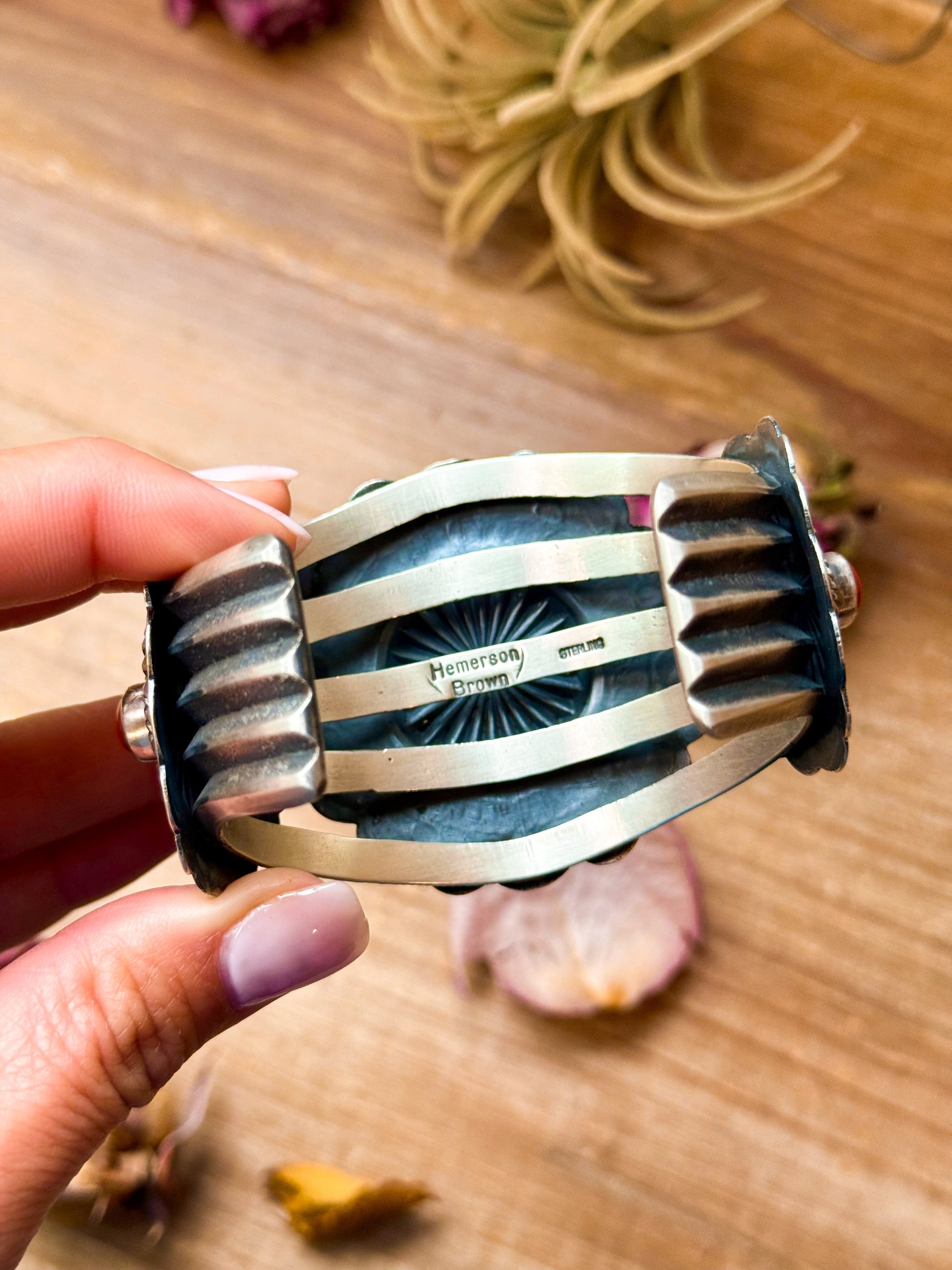 This Native made jewelry set includes a stunning sterling silver cuff, adjustable ring, and matching coral dangle earrings, all handcrafted with care and tradition. The cuff and ring are made by Navajo artist Emerson Brown, featuring genuine coral stones in detailed silver settings. The earrings feature a post-on-top design with dangling coral drops, adding movement and charm. Each piece is stamped “Sterling” and showcases the timeless craftsmanship of Native artistry — a complete, collectible set you’ll treasure forever.