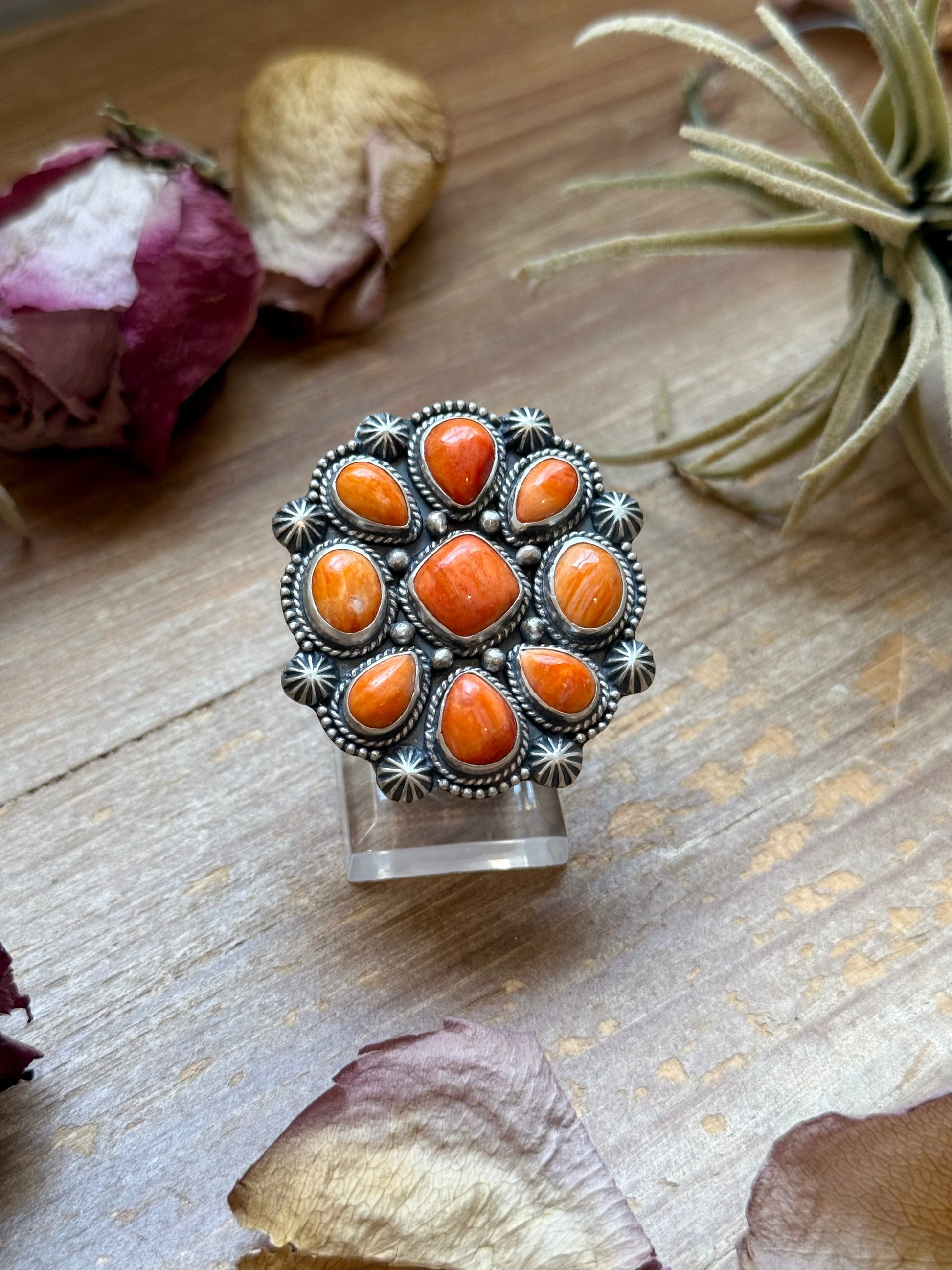 Sterling Silver Orange Spiny Oyster Mosaic Cluster Ring Size 7.5, Artist Shay Pfeiffer