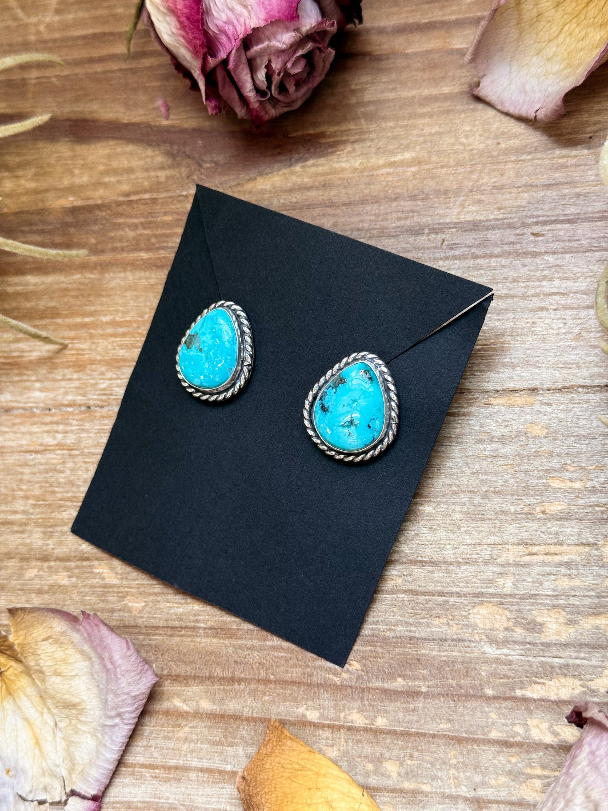 These Whitewater Turquoise stud earrings are handmade by silversmith Jason Ogg in solid sterling silver, featuring genuine Whitewater Turquoise stones known for their light sky-blue color and stunning natural matrix. Each pair is stamped “Sterling” and marked with Jason Ogg’s artist hallmark, reflecting his signature attention to craftsmanship and detail. Elegant and timeless, these earrings are perfect for everyday wear or as a special gift for any turquoise lover.
